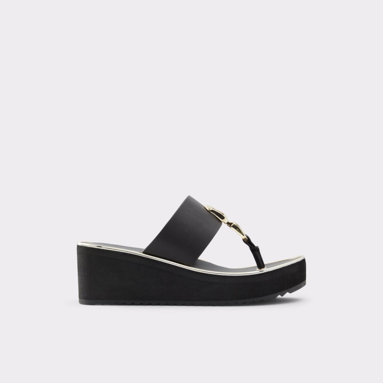 Super-comfortable, these bone-colored, thong-style sandals with gold-tone detailing bring a thick, cushioned sole and gentle wedge heel that makes them perfect for a day of shopping.