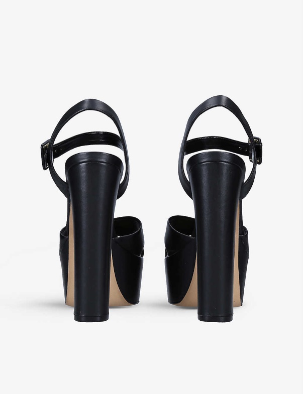 Open almond toe, platform sole, smooth finish, crossed toe straps, adjustable buckled ankle strap, high block heels